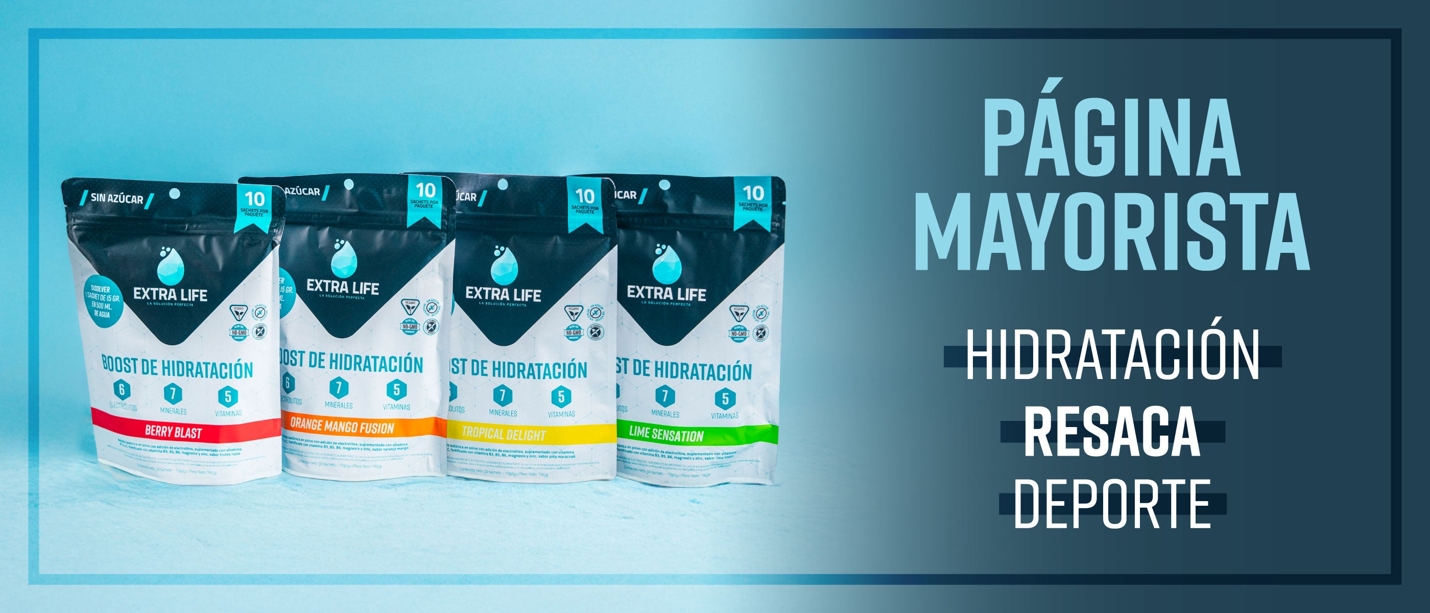 Extra Life es una bebida isotónica en polvo en formato sachet, con más de 1393 mg de electrolitos, vitaminas y minerales creada para combatir los efectos de la deshidratación y ayudarte con tu recuperación.