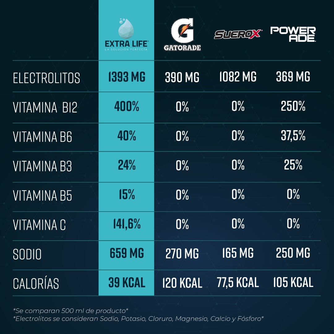 Si bien nuestro marketing se ha enfocado en otro propósito, Extra Life es perfecto para la rehidratación y recuperación de electrólitos que uno pierde al hacer deporte. Hoy por hoy es la bebida isotónica con más electrolitos.